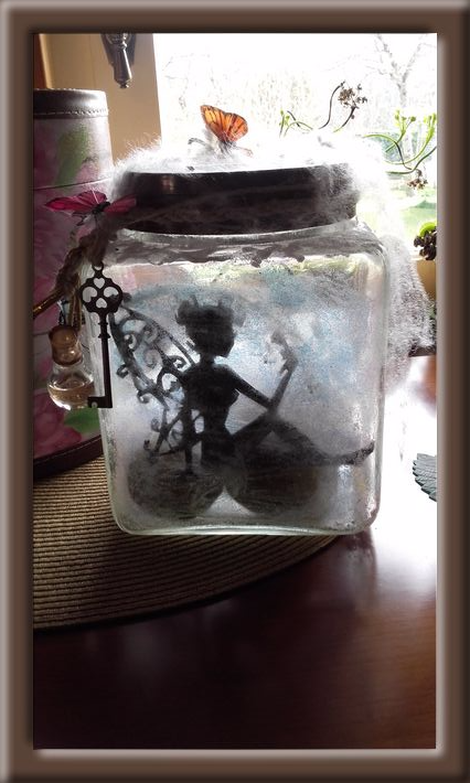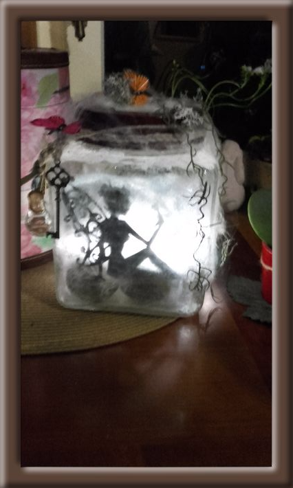 un vieux bocal une silhouaite découpée dans du papier cartonner noir de la fausse toile d'arraignée des petites décos une girlande de dix ledes et vous aurez une lanterne magique .